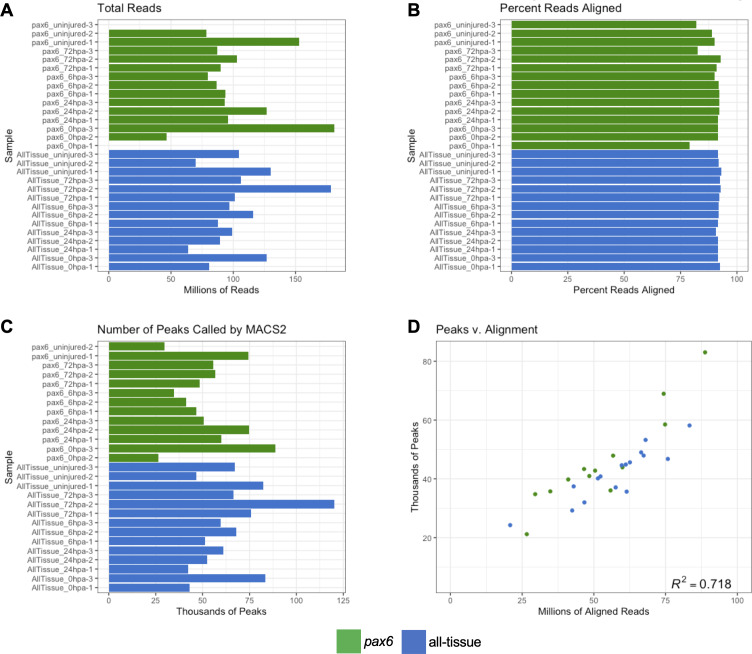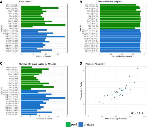 Figure 2—figure supplement 1. Low input ATAC-Seq libraries meet sufficient quality for downstream analysis.(a) Barplot of total number of reads sequenced for each library. (b) Barplot of the percent reads aligned to the genome by Bowtie2 (c) Barplot of the number of peaks called from aligned reads by MACS2. (d) Correlation plot of number of aligned reads to number of called peaks. Reads and peaks aligns with correlation coefficient of r2 = 0.785. |