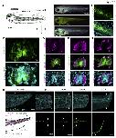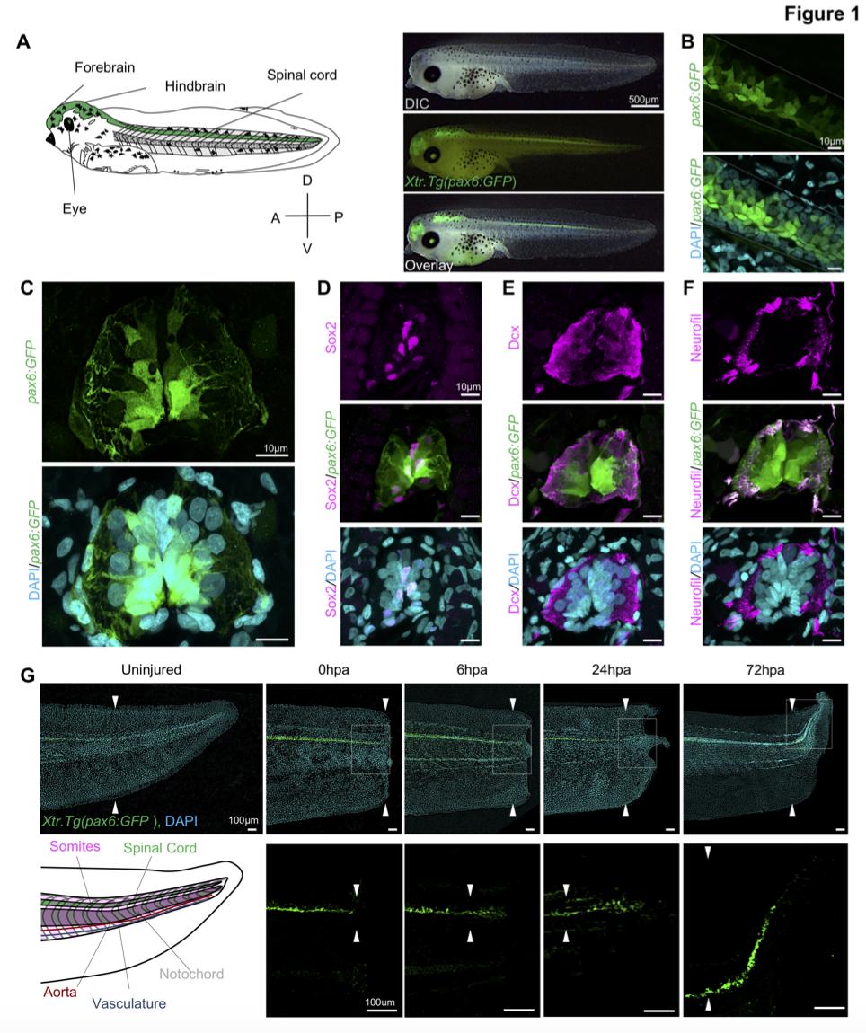Figure 1. Expression dynamics of pax6:GFP in the regenerating spinal cord. (A) Left, cartoon depiction of a NF stage 41 tadpoles with known pax6+ domains colored green. Right, Stage 41, transgenic tadpole expressing GFP under the control of pax6 promoter tadpole. For all images in this figure, the green channel represents pax6 reporter GFP fluorescence and the cyan channel represents DAPI staining. (B) Confocal image of a lateral view of a whole-mount transgenic stage 41 tadpole. (C-F) Transverse cryosections through the posterior spinal cord of a transgenic stage 41 tadpole. (D-F) Immunofluorescence images of the spinal cord sections stained with (D) anti-Sox2, (E) anti-Dcx, and (F) anti-neurofilament. (G) Regeneration timecourse of Xtr.Tg(pax6:GFP) tadpole over the first 72 hours following tail amputation. The white box in the top photos correspond with enlarged green channel below. White arrows indicate amputation plane. |
