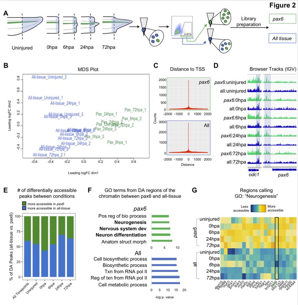 Figure 2. Pax6 ATAC-Seq libraries resolve accessible neural specific regions that were not identified in all-tissue libraries. (A) Experimental design for FACS isolation of reporter cells for sequencing library preparations. (B) MDS plot of sequenced pax6 and all-tissue ATAC-Seq libraries. (C) Representative histograms showing distance of called peaks to transcription start sites (tss). (D) IGV browser tracks of a house keeping gene, odc and reporter line specific gene, pax6. Shaded bar in odc represents a peak retained in pax6 and all-tissue libraries; shaded bar in pax6 represents a peak called in pax6 libraries, but not in all-tissue. (E) Bar plot showing percent of differentially accessible (DA) peaks that are more accessible in pax6 or all-tissue libraries within an individual timepoint or across all timepoints. (F) Differentially accessible regions were annotated to the nearest TSS and used to call GO:BP terms. Top, GO terms from regions more accessible in pax6 libraries than in all-tissue libraries. Bottom, GO terms from regions more accessible in all-tissue libraries than pax6 libraries. (G) Heat map depicting accessibility of 21/254 randomly sampled peaks that call the GO term: Neurogenesis. pax6 promoter region is boxed. |