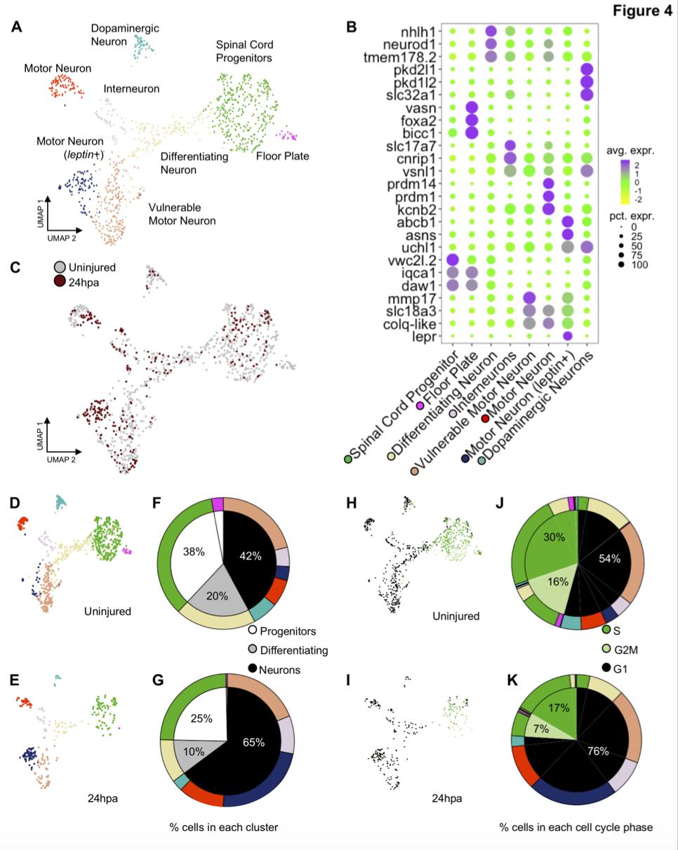 Figure 4. scRNA-Seq of uninjured and 24hpa tails reveals a transcriptional shift to differentiated neuronal types at 24hpa. (A) UMAP projection of integrated uninjured and 24hpa neural lineage cells. 7 distinct clusters were identified. (B) Dot plot of genes identified as differentially expressed between cell clusters. The top 3 genes exclusively expressed in each of the 7 clusters are shown. Color of circle denotes average gene expression across one cluster and size of circle represents percent of cells in each cluster expressing each gene. (C) UMAP projection of neural cells colored by timepoint in the uninjured tails and 24hpa tails. UMAP projections of cell clusters split by timepoint to (D) uninjured and (E) 24hpa. (F-G) Sunburst diagrams showing (inside) the percentage of neural cells that are broadly stem cells, differentiating cells, or differentiated neurons and (outside) percentage of neural cells in each of the seven cell clusters called. Colors on outside of the sunburst chart correlate to cluster colors in (A/B). (H-I) UMAP projections of neural clusters colored by predicted cell cycle phase in the (H) uninjured tail and (I) 24hpa tail. (J-K) Sunburst diagrams showing the percentage of all neural cells predicted to be in each cell cycle phase (inside) and the percentage of each cell cluster predicted to be in each cell cycle phase (outside). (J) represents the distribution in the uninjured tail and (K) represents the distribution in the 24hpa tail. Colors on outside of the sunburst chart correlate to cluster colors in (A/B). |