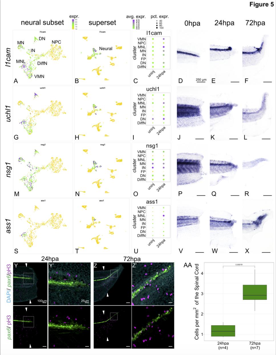 Figure 5. Markers of neuronal differentiation are increased at 24hpa and proliferation increases at 72hpa. UMAP plots of expression in the neural restricted subset of scRNA- Seq for (A) l1cam, (G) uchl1, (M) nsg1, and (s) ass1. UMAP plots of expression in the superset scRNA-Seq dataset for (B) l1cam, (H) uchl1, (N) nsg1, and (T) ass1. Note that the topology of neural cell clusters is slightly different when subset and reclustered to give high neural cluster resolution (A,G,M,S) than when neural cells are analyzed together with all other cell types (E,K, Q, W), but the same cells and expression data are included in both cases. Dot plots representing average expression of (C) l1cam, (I) uchl1, (O) nsg1, and (U) ass1 per cluster and timepoint. In situ hybridization at 0hpa, 24hpa, and 72hpa for (D-F) l1cam, (J-L) uchl1, (P-R) nsg1, and (V-X) ass1. (Y-Zâ) Representative images of 24hpa (Y/Yâ) and 72hpa (Z/Zâ) regenerated tails from a pax6:GFP transgenic tadpole stained for DAPI (cyan) and mitotic cells with phospho- histone3 (magenta). The white arrows indicate regeneration plane. (Yâ) and (Zâ) are enlarged images of the boxed areas in (Y) and (Z). (AA) Boxplot representing the number of cells per regenerated spinal cord area (mm2) at 24hpa and 72hpa. Statistics represent t-test performed between the two timepoints. Abbreviations: Neural Progenitor Cell (NPC), Differentiating Neuron (Diff), Interneuron (IN), Vulnerable Motor Neuron (VMN), Dopaminergic Neuron (DN), Motor Neuron Leptin+ (MNL), Motor Neuron (MN)) |