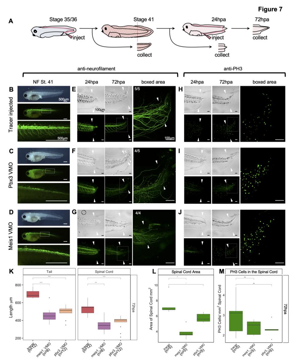 Figure 7. Pbx3 and Meis1 are independently required for successful regeneration of neural tissues and tails in response to injury. (A) Injection scheme for administering vivo-morpholino. Stage 35 tadpoles were injected with a tracer or vivo-morpholinos (VMO) targeting meis1 or pbx3 and allowed to grow 24 hours to stage 41. Stage 41 tadpoles were amputated and 24hpa regenerates were collected. (B-D) Stage 41, whole-mount tadpoles shown in brightfield and immunostained against neurofilament. The box in the middle image corresponds to the enlarged image below. These images are shown for (B) tracer injected, (C) Meis1 VMO injected, and (D) Pbx3 VMO injected tadpoles. (E-J) 24hpa and 72hpa regenerates were collected and stained for neurofilament (E-G) or PH3 (H-J). Top photos are in DIC and bottom photos are immunostained as indicated. White arrows indicate amputation plane. These images were collected for (E, H) tracer, (F, I) Meis1 VMO, and (G, J) Pbx3 VMO. (K) Regenerated tail and spinal cord lengths were measured and reported in boxplots. (L) Boxplot representing regenerated spinal cord area. (M) Boxplot representing PH3 cells per regenerated spinal cord area. Statistics represent a two-tailed t-test to determine significance between conditions. (ns= not significant, *<0.05, **<0.005, ***<0.0005, ****<0.00005). |