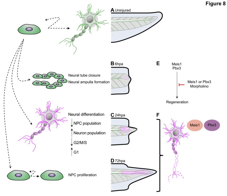 Figure 8. Model for neural progenitor regeneration. (A) In normal development, neural progenitor cells make cell fate decisions to proliferate or differentiate. From this study we predict from our ATAC-Seq and scRNA-Seq analysis that neural progenitors first prioritize (B) migration and tube morphogenesis at 6hpa, followed by (C) neural differentiation at 24hpa, and then (D) turn on proliferation programs at 72hpa. (E) From integrative analysis of these data sets, we identified meis1 and pbx3 as candidate regulators of NPC regeneration at 24hpa and 72hpa. Loss-of-function experiments suggest Meis1 and Pbx3 are necessary for successful regeneration as well as proper axonal patterning. Magenta shaded spinal cord represents NPCs in regenerated spinal cord. Magenta axons represent axons in the regenerated spinal cord and tail tissue. |