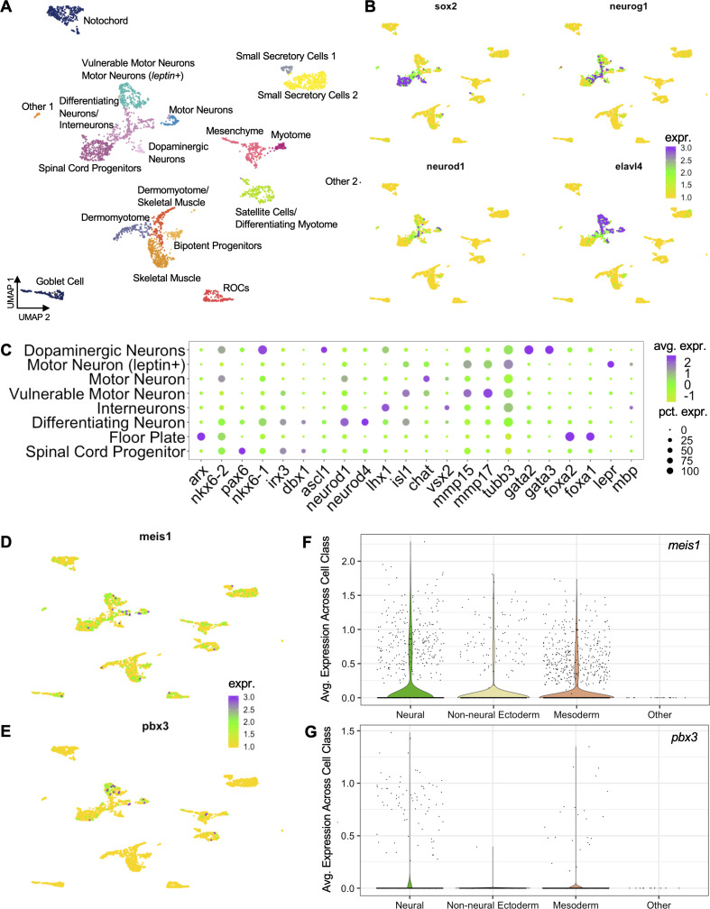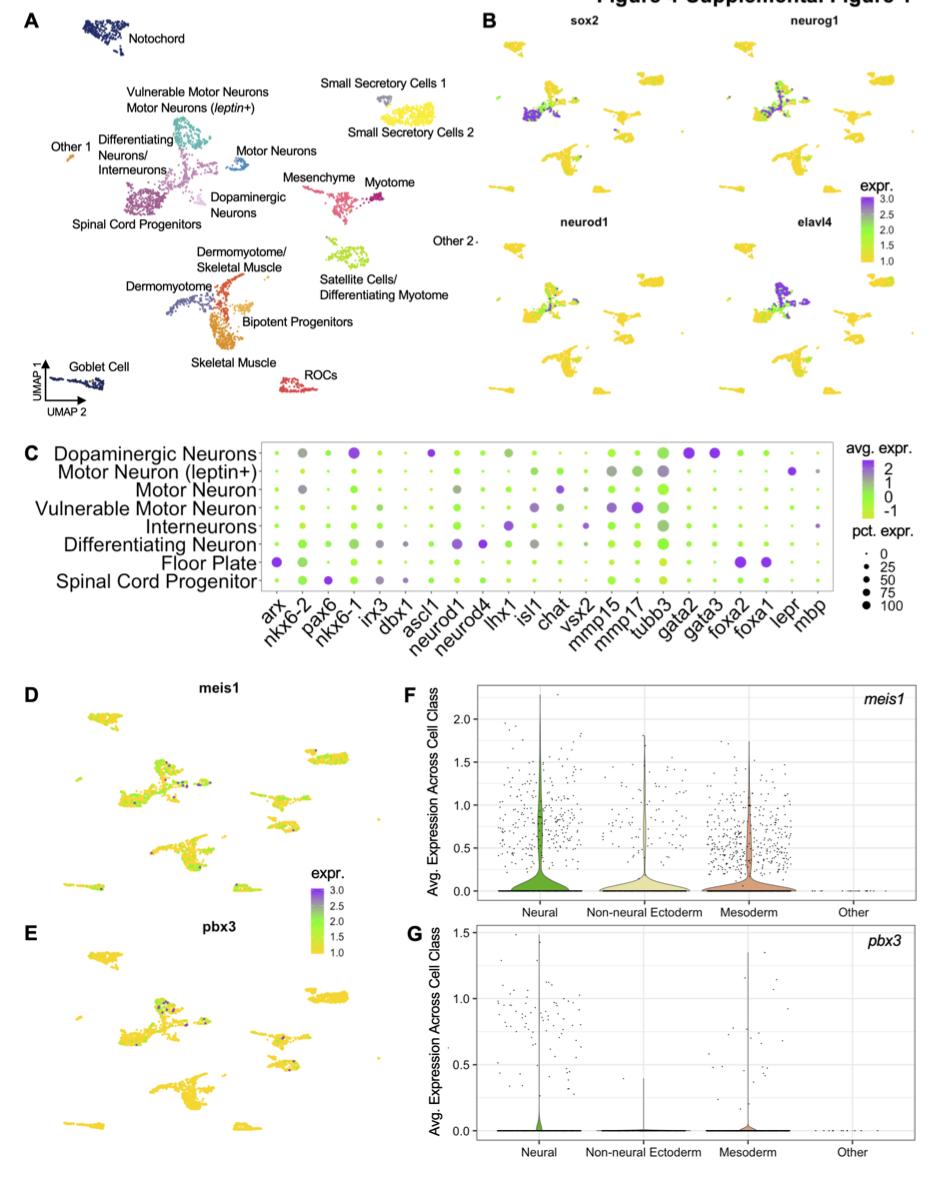 Supplement figure 3. scRNA-Seq analysis of all cells sequenced in uninjured and 24hpa tails. (A) UMAP dimensionality reduction and cluster assignment of integrated cells from uninjured and 24hpa tails. These cells are a superset of the 7 clusters shown in Figure 4. (B) UMAP plots of cell colored by expression of neural lineage markers. Sox2 was used to identify neural stem cells, neurod1 and neurog1 were used to identify differentiating neurons, and elavl4 was used to identify differentiated neurons. 6 cell clusters were identified by these markers as neural lineage clusters. (C) Dotplot showing expression of genes used to determine neural identities as defined by Aztekin et. al. Size of circle represents percentage of cells in cluster expressing gene and color denotes average expression of a gene across a cluster. UMAP plots of cells colored by expression for (D) meis1 and (E) pbx3 across all cells. Violin plots showing distribution of gene expression for (F) meis1 and (G) pbx3. In the violin plots, cell types from (A) were grouped into broader cell lineages. |