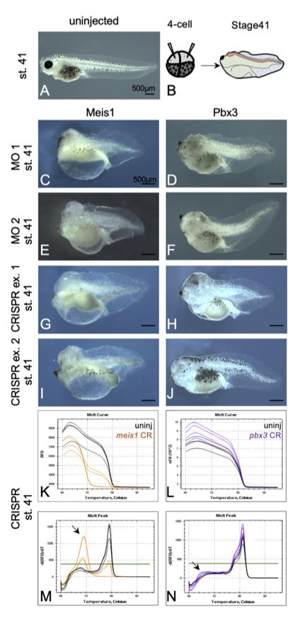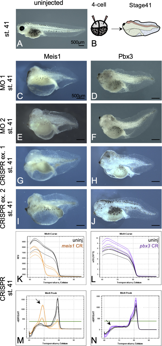 Supplement figure 4. Embryonic Meis1 and Pbx3 morphants are characterized by small heads and missing or small eyes. (A) Uninjected, stage 41 tadpole. (B) Injection schematic showing injections were made in the 2 dorsally fated blastomeres at the 4-cell stage. (C-F) Stage 41, morphant tadpoles that were independently injected with two sets of translation blocking morpholinos against (C, E) Meis1 and (D, F) Pbx3. Two different MO sequences were used for each gene. (G-J) Stage 41, mutant tadpoles that were injected with Cas9 and gRNA against (G,I) meis1 and (H,J) pbx3. Two representative animals are shown for each gRNA set; only one gRNA set was used per gene. (K-N) CRISPR mutant tadpoles were analyzed for mutations by high resolution melt (HRM) analysis. Melt curve and peak chart for (K,M) meis1 and (L,N) pbx3 are shown. Black lines depict wild-type siblings from the same clutch whereas orange lines represent meis1 mutants and purple lines depict pbx3 mutants. Black arrowheads indicate the position of curve shift for mutants relative to wild-type siblings. |