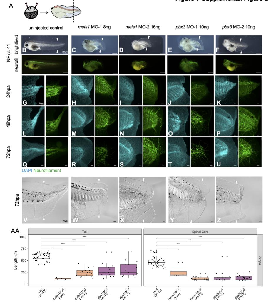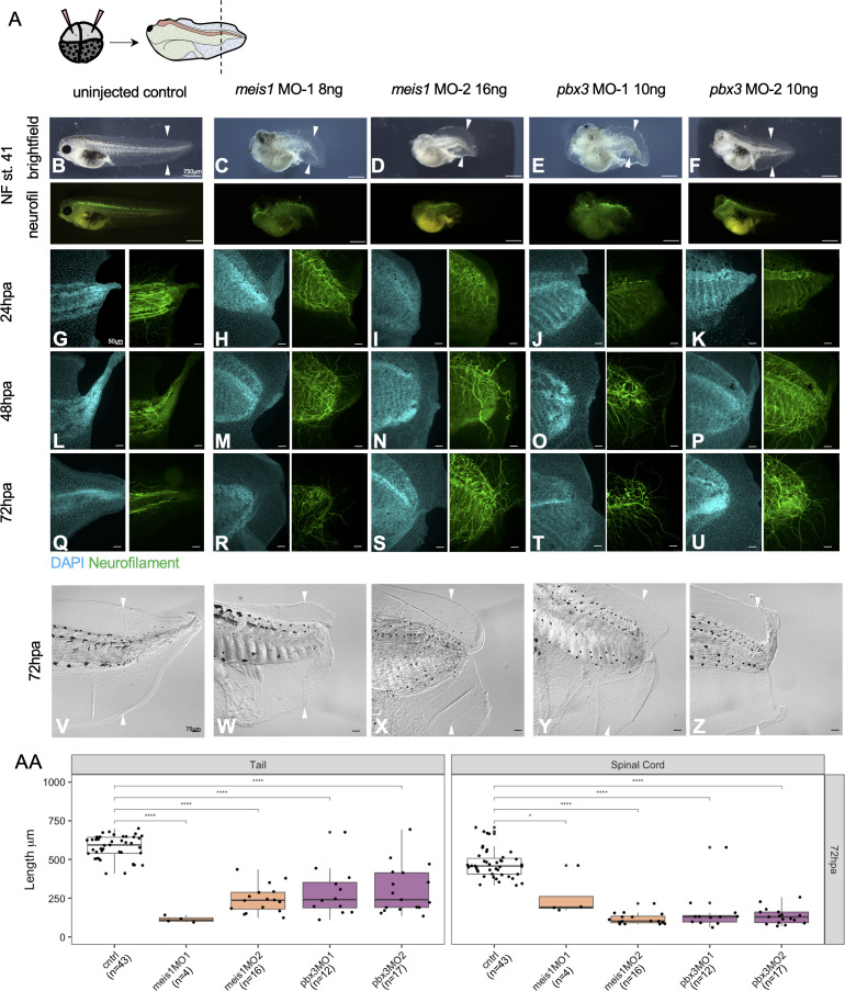 Figure 7âfigure supplement 2. Meis1 and Pbx3 are independently necessary for successful regeneration of the axial tissue and neuronal patterning.(A) Experimental set up for morpholino injections and amputations. Two sets of morpholinos were injected per gene to dorsally fated blastomeres at the 4 cell stage. Embryos were reared to stage 41 for amputation. Representative images of uninjured stage 41 (B) control, (C, D) Meis1 morphants 1 and 2, and (E, F) Pbx3 morphants 1 and 2. Images are shown in bright field and immunostained for neurofilament. Stage 41 tadpoles were amputated and collected at (GâK) 24hpa, (LâP) 48hpa, and (QâU) 72hpa. The cyan channel represents tails stained with DAPI and the green channel represents tails immunostained for neurofilament. Scale bar: 75 um. (VâZ) Brightfield images of the 72hpa tails. Scale bar: 50 um. (AA) Boxplots representing length of regenerated tail or spinal cord for each tadpole. Statistics represent a two-tailed t-test to determine significance between conditions. (*<0.05, **<0.005, ***<0.0005, ****<0.00005).Figure 7âfigure supplement 2âsource data 1. Regenerated Tail Length Data for Embryonic Morphants. |