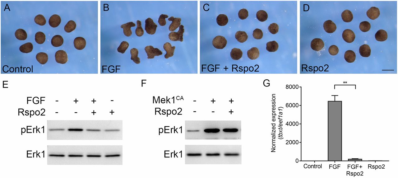 Fig. 1. Rspo2 inhibits ectoderm response to FGF but not MEK1. (A-G) Four-cell stage embryos were injected animally with Rspo2 RNA (0.5â ng) and Mek1CA RNA (12â pg), as indicated. Ectoderm explants were dissected at stage 8 and treated with 100â ng/ml FGF2 protein. When control embryos reached stage 13, the explant morphology was imaged (A-D) or lysed for immunoblot or RT-qPCR analysis (E-G). (A) control uninjected ectoderm explants. (B) FGF-treated explants. (C) Rspo2-expressing explants stimulated with FGF. (D) Rspo2-expressing explants. Ten ectoderm explants were used per group in each experiment. The experiments were repeated five times. (E,F) Modulation of Erk1 activation by Rspo2. Immunoblotting was carried out with the antibodies against pErk1 and total Erk1. Data represent three to five independent experiments. (G) Rspo2 inhibits FGF-dependent induction of tbxt. RT-qPCR analysis was performed for tbxt and normalized by eef1a1. The graph shows a representative experiment with triplicate samples from three independent experiments. Data are mean±s.d. Statistical significance was assessed by Student's t-test. **P