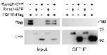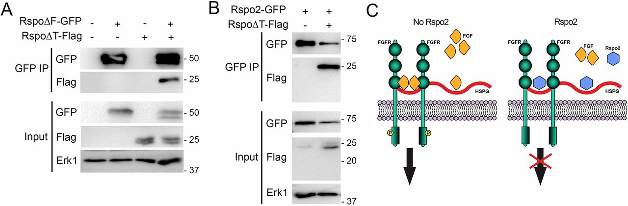 Fig. 4. The intramolecular interaction of protein domains in Rspo2. Four-cell stage embryos were injected with RNAs encoding RspoÎF-GFP, RspoÎT-Flag alone or co-injected. The embryos were cultured until stage 12 and lysed for GFP pulldown. (A) RspoÎT-Flag is co-immunoprecipitated (IP) by RspoÎF-GFP. (B) RspoÎT-Flag is co-immunoprecipitated by Rspo2-GFP. (C) Putative mechanistic model of FGF pathway inhibition by Rspo2. The association of Rspo2 with HSPGs prevents FGF ligand binding and signaling.