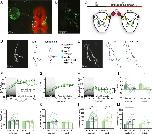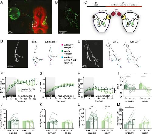 Fig. 1. Ipsi RGC axons respond differentially to simulation of the ipsi and contra eyes. (A) EGFP-electroporated eye (green) projecting to BODIPY-labeled tectum (red). (B) Ipsi RGCaxon from rectangle in A. (C) Experimental protocol: ipsi axon imaged every 10 min over 1-h baseline in darkness and 2-h visual stimulation of the ipsi or contra eye via optical fiber. (D and E) Ipsi RGCaxon arbors undergoing (D) contra eye stimulation or (E) ipsi eye stimulation in the tectum. Reconstructed arbors show cumulative changes during 1 h in darkness and the last hour of stimulation, indicating added or elongated (magenta), lost or retracted (green), and transient (both added or elongated and lost or retracted within 1 h, blue) branch tips. (F) Total branch tip number (TBTN) normalized to initial number. (G) Total branch length (TBL) normalized to initial length. (H) Branch density (branch number/total length) normalized to initial density. (I) Net change in TBTN every 10 min binned by hour. (J) Mean number of branch additions every 10 min normalized to mean additions in darkness. (KâM) Data binned as in J for (K) elongation (mean length added every 10 min of growing branches, normalized to elongation in darkness), (L) losses, and (M) retraction. All graphs present ipsi axons from contra-eye-stimulated (n = 10, dark green) and ipsi-eye-stimulated (n = 7, light green) animals. Mixed-design two-way ANOVA, Bonferroniâs post hoc test to compare hours is indicated above bar graphs, and interaction of time vs. eye stimulated is indicated to the right of time plots (*P < 0.05, **P < 0.01, ***P < 0.001).