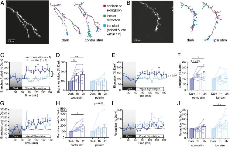 Fig. 2. TeNT expression in ipsi RGCaxon enhances dynamic branch additions in response to contra, but not ipsi, eye stimulation. (A and B) TeNT-expressing ipsi RGCaxon arbors undergoing (A) contra eye stimulation or (B) ipsi eye stimulation. Reconstructed arbors show cumulative changes during 1 h in darkness and the last hour of stimulation. (C and D) Mean branch additions every 10 min, (C) normalized to mean additions in darkness and (D) binned by hour. (EâJ) Corresponding graphs for (E and F) branch elongation, (G and H) losses, and (I and J) retraction. All graphs present TeNT-expressing ipsi axons from contra-eye-stimulated (n = 7, dark blue) and ipsi-eye-stimulated animals (n = 9, light blue). Mixed-design two-way ANOVA to compare hours is indicated above bar graphs, and interaction of time vs. eye stimulated is indicated to the right of time plots (*P < 0.05, **P < 0.01).
