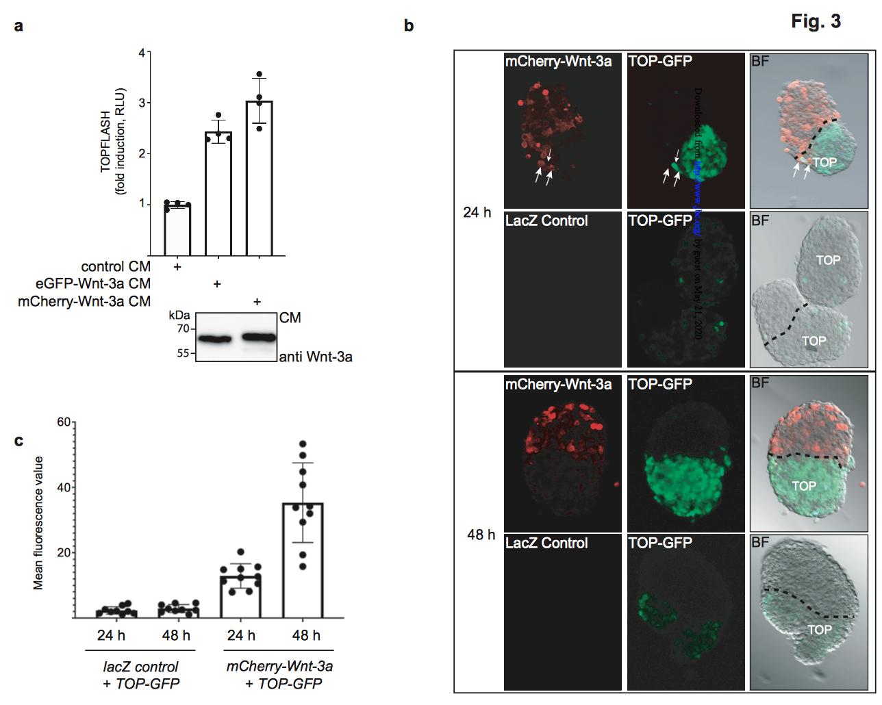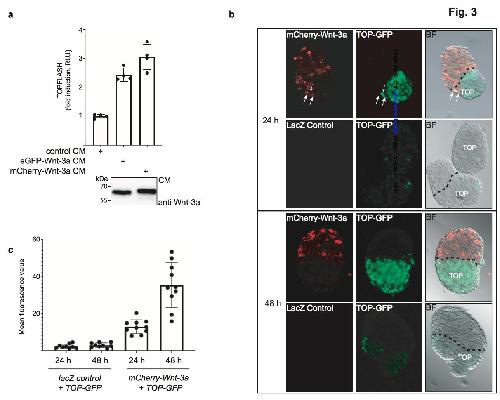 Figure 3. Diffusion of mCherry-Wnt-3a within spheroids. a) TOPFLASH TCF reporter assay showing the comparative activities of mCherry-Wnt-3a and eGFP-Wnt-3a, when applied to HEK293 cells as L cell conditioned medium (CM). Error bars represent ± SD from mean of 4 independent biological samples, represented as solid dots. The experiment was performed 2 times with similar results. Western blot analysis showing eGFP-Wnt-3a and mCherry-Wnt-3a proteins in the CM is shown in lower panel. b) HEK293T cell spheroid fusion assay for visualisation of paracrine Wnt/β-catenin signaling. mCherry-Wnt-3a or control LacZ transfected HEK293 cells were used to form spheroids, which were then combined with spheroids prepared from a stable TOP-GFP HEK293 reporter cell line. 24 or 48 hours later, merged spheroids were imaged using laser scanning confocal microscopy for activation of Wnt/β-catenin signaling in the TOP-GFP reporter cells (green cells). The two lower arrows mark mCherry-Wnt3a producing cells flanking a highly-activated TOP-GFP reporter cell (smaller upper arrow). BF, bright-field image showing fused spheroids with the dashed line demarking the border between the Wnt secreting/control cells and the TOP-GFP reporter cells (TOP). The presented images are representative of findings obtained from 3 independent experiments. c) Bar graph showing the relative fluorescent intensities measured in the TOPâGFP spheroids shown in Fig. 3b, calculated from at least 9 merged spheroids in each of the assays conditions. Error bars represent mean ± SD from 10 independent fluorescence intensity values, represented as solid dots. The fluorescence intensity of the 24 h control TOP-GFP spheroids is set to 1. |