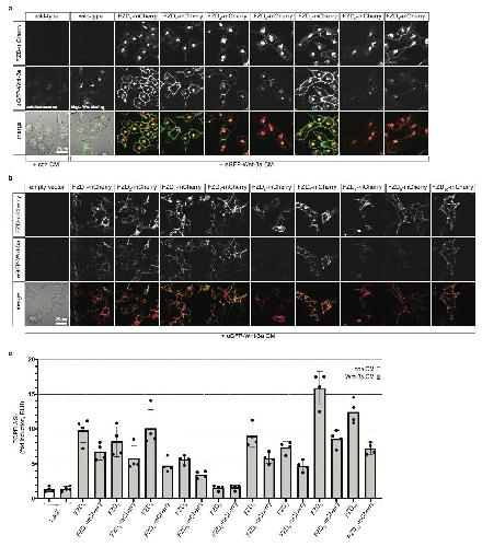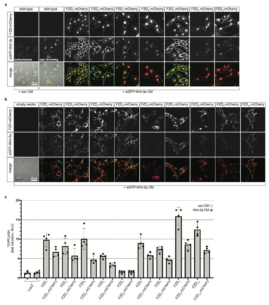 Figure 4. Association of eGFP-Wnt-3a with different FZDs. a) Laser scanning confocal microscopy images of living NCI-H1703 cells with stable integration of the indicated mouse FZD-mCherry gene, incubated for 3 hours with eGFP-Wnt-3a conditioned medium (CM) derived from L cells. b) Laser scanning confocal microscopy images of living âFZD1-10GFP-free HEK293 cells transiently transfected with the indicated mouse FZD-mCherry gene and incubated for 1 hour with eGFP-Wnt-3a CM derived from L cells. A direct comparison of the fluorescent intensities between the two cells lines in (a) and (b) is provided in Fig. S3b. c) TOPFLASH TCF reporter assay responses in âFZD1-10 HEK293 cells, showing the relative Wnt/β-catenin signaling activity of the indicated mouse FZDs as well as their mCherry tagged counterparts. Error bars represent ± SD from mean of 4 independent biological samples, represented as solid dots. The experiment was performed 3 times with similar results. |