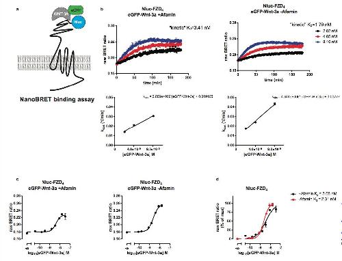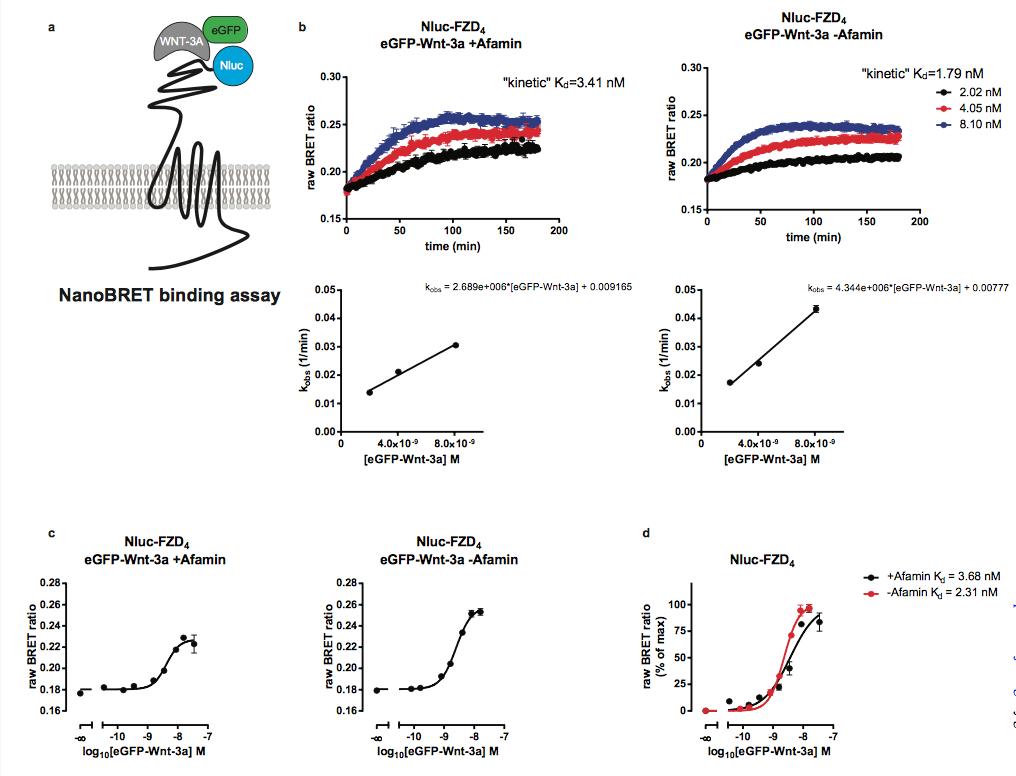 Figure 5. eGFP-Wnt-3a binding to Nluc-FZD4. a) Schematic illustration of the NanoBRET setup to detect eGFP-Wnt-3a binding to Nluc-FZD-tagged receptors. b) Association kinetics of the HEK293F suspension cell-derived eGFP-Wnt-3a to Nluc-FZD4 were determined by the detection of NanoBRET in transiently-overexpressing living ÎFZD1-10 HEK293 cells over time. The eGFP-Wnt-3a was produced either with (left graph) or without (right graph) cellular co-expression of Afamin. NanoBRET was sampled once per 60 sec for 180 min. Data points are presented as mean ± SD (+Afamin) or mean ± SEM (-Afamin) from n=3 individual experiments, fitting a one-phase association model. The kobs values from the individual eGFP-Wnt-3a association curves were plotted over eGFP-Wnt-3a concentration. c) Saturation curves are presented as sigmoidal curves with logarithmic eGFP-Wnt-3a concentrations (the left panel for eGFP-Wnt-3a + Afamin and the right panel for eGFP-Wnt-3a - Afamin). Graphs present raw NanoBRET values obtained following 2 h ligand exposure to living ÎFZD1-10 HEK293 cells transiently-overexpressing Nluc-FZD4. d) Raw BRET ratio values for eGFP-Wnt-3a binding from c were normalized to 0 and 100 % to emphasize the difference in affinity. Data points are presented as mean ± SEM from n=3 individual experiments. |