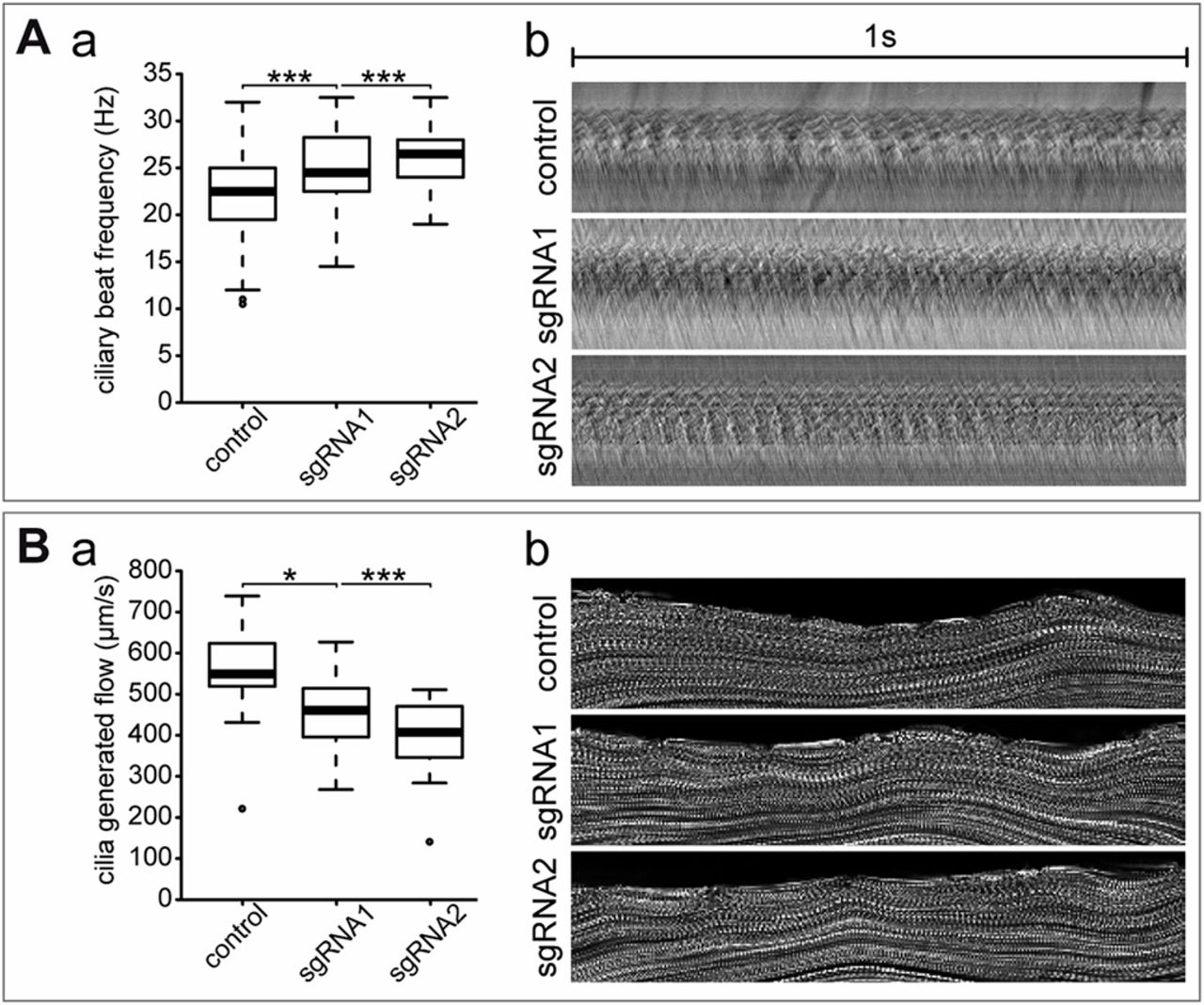 Fig. 4. Ciliary defects in MCCs of Xenopus cfap206 crispants. (A) Enhanced ciliary beat frequency (CBF) in crispants. (a) Statistical evaluation of CBF in wild-type and cfap206 crispants. Results from three independent experiments with 15 embryos each and five analysed MCCs per embryo. Raw data are shown in Table S3. (b) Kymographs of ciliary motility of single MCCs, generated from control wild-type, sgRNA1- and sgRNA2-injected specimens. (B) Reduced bead transport in cfap206 crispant skin mucociliary epithelia. (a) Velocities of bead transport in wild-type, sgRNA1- and sgRNA2-injected specimens. Results from three independent experiments with eight analysed specimens each. Raw data are shown in Table S2. (b) Maximum intensity projections of single control wild-type, sgRNA1- and sgRNA2-injected embryos. The boxplots show values between the first and third quartile (boxes), with the whiskers displaying ± 1.5à the interquartile range (IQR); i.e. box length=IQR=Q3ÃQ1; upper whisker=Q3+1.5ÃIQR, lower whisker=Q1Ã1.5ÃIQR. *PP