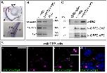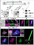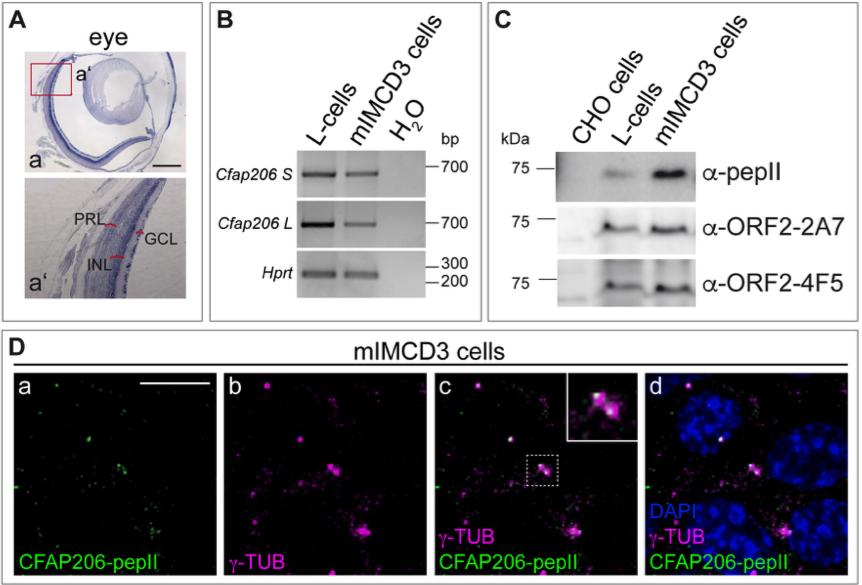 Fig. 3. Subcellular localisation of CFAP206 protein to the axoneme and basal bodies. (A) Schematic depiction of short (CFAP206S; upper row) and long (CFAP206L; lower row) CFAP206 protein. Coloured boxes indicate position of peptides (green, pepI; orange, pepII; cyan, ORF2) used to generate antibodies. Detection of tagged CFAP206 overexpressed in CHO cells and of endogenous CFAP206 protein in lysates of mouse testis with the different antibodies. The full-size western blots are shown in Fig. S9. (B) Localisation of endogenous CFAP206 (anti-pepII) to cilia on respiratory epithelial cells (a-d) and flagella of spermatozoa (e-g). Boxed areas in a-d indicate the region shown in aâ²-dâ². Arrowheads in d and dâ² indicate localisation of CFAP206 non-overlapping with acetylated α-tubulin (ac-TUB). Arrows highlight ciliary tips, which lack CFAP206. (C) Subcellular localisation of murine GFP-CFAP206 in Xenopus skin MCCs. (a) Co-staining with the basal body marker centrin4-RFP (Cetn4-RFP; a). Orthogonal projection shown in aâ² demonstrates partial overlap at the basal body. (b) Co-staining with phalloidin to highlight F-actin and the basal foot marker tubulin gamma-1 (Tubg1) confirmed basal body staining (bâ²) and partial overlap at the basal foot (bâ²). (c-câ²) Axonemal staining, as shown by co-staining with an antibody against acetylated alpha-tubulin (ac-Tuba4a). (d) Cartoon of GFP-CFAP206 localisation at the Xenopus cilium. Scale bars: 10â