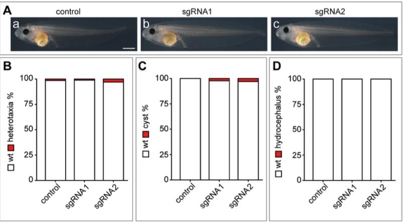 High-speed (800 frames per second (fps)) videography of single MCCs at stage 32. Left: wild type (control); middle: sgRNA1 crispant; right: sgRNA2 crispant. Note that cilia were motile in all cases. Movie plays at 15 fps, i.e. at about 0.02x real time.