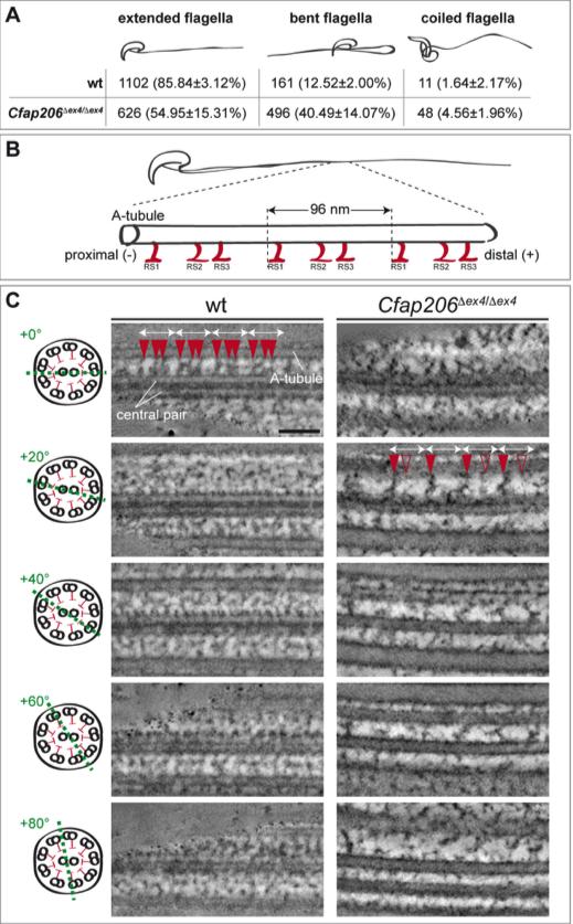 nm. In Cfap206Îex4/Îex4 mutant sperm tails (c), the radial spokes were rather irregular and/or incomplete (unfilled red arrowheads) and missing. (b,d) Cross-sections of the wild-type and Cfap206Îex4/Îex4 tomograms shown in a,c, respectively. Green stars indicate ODFs. Further details of the tomography and section planes are shown in Fig. S5B,C. Scale bars: 2â