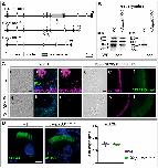 Fig. 7. Non-functional spermatozoa of Cfap206Îex4/Îex4 mutant males. (A) Hematoxylin and Eosin-stained sections of wild-type (a,b) and Cfap206Îex4/Îex4 mutant (c,d) testes (a,c) and epididymides (b,d). (B) CASA analysis and results of IVF showing normal sperm concentration in Cfap206Îex4/Îex4 mutants (a), reduced Cfap206Îex4/Îex4 sperm motility (b), inability of Cfap206Îex4/Îex4 sperm to support early development after IVF (c) and reduced attachment to the zona pellucida in vitro (e). (d) Wild-type egg with wild-type sperm cells. (e) Wild-type egg with Cfap206Îex4/Îex4 sperm. Raw data from CASA analysis (a,b) and IVF (c) are shown in Table S8 and Table S9, respectively. (C) Bright-field (a-l) and fluorescence (aâ²-lâ²) images of wild-type (a,aâ²-f,fâ²) and Cfap206Îex4/Îex4 (g,gâ²-l,lâ²) sperm cells isolated from the cauda epididymis. The following dyes and antibodies were used to visualise organelles and subcellular compartments: DAPI (nuclei; aâ²-lâ²; blue); anti-ac-TUB (axonemes; aâ²-câ²,gâ²-iâ²; magenta); PNA-lectin (acrosomes; aâ²,gâ²,hâ²,jâ²; green); anti-AKAP3 (fibrous sheath; bâ²,hâ²; green); anti-SEPT7 (annuli; câ²,eâ²,iâ²,kâ²; green); and anti-COXIV (mitochondria; dâ²-fâ²,jâ²-lâ²; magenta). Arrowhead in gâ² highlights a coiled flagellum with PNA-stained material; arrows in câ²,eâ²,iâ²,kâ² indicate annuli. Data are mean±s.d. in B with individual data points shown. Scale bars: 100â