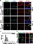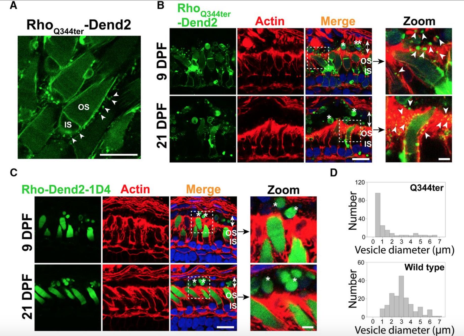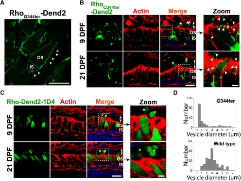 Figure 1- Class I mutant rhodopsin is released as microvesicles before being engulfed by RPE cells. A) Live retina explant was imaged at 9 DPF. Vesicles (arrowheads) were observed in the extracellular space surrounding rods expressing class I mutant rhodopsin, RhoQ344ter-Dend2. B) Cross sections of retinas expressing RhoQ344ter-Dend2 (Dend2, green) labeled with phalloidin-Alexa Fluor 633 (Actin, red) and Hoechst 33342 dye (Nuclei, blue). Microvesicles containing RhoQ344ter-Dend2 were in close contact with the actin filaments of the RPE microvilli (Zoom, arrowheads) and within RPE cytoplasmic space (Merge, indicated by double-headed arrows). Microvesicles were observed both at 9 DPF (top panels) and 21 DPF (bottom panels). Large OS fragments (single asterisk) or cell bodies (double asterisks) also existed within the RPE cell layer (double-headed arrows). C) Cross sections of retinas expressing Rho-Dend2-1D4 (Dend2, green) were labeled with phalloidin-Alexa Fluor 633 (Actin, red) and Hoechst 33342 dye (Nuclei, blue). OS fragments (Zoom, single asterisk) containing Rho-Dend2-1D4 were visible in cytoplasmic space (Merge, double-headed arrows) of the RPE cells. Retinas were imaged either at 9 DPF (top panels) or at 21 DPF (bottom panels). D) Size distribution of green fluorescent structures/vesicles found in the RPE of animals expressing RhoQ344ter-Dend2 (Q344ter, based on 180 structures from nâ=â4 animals) or Rho-Dend2-1D4 (wild type, based on 180 structures from nâ=â4 animals) at 21 DPF. Scale bars:â Zoom, 1âμm; other panels, 10âμm. |