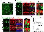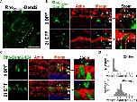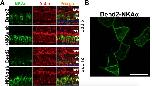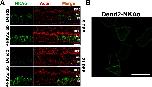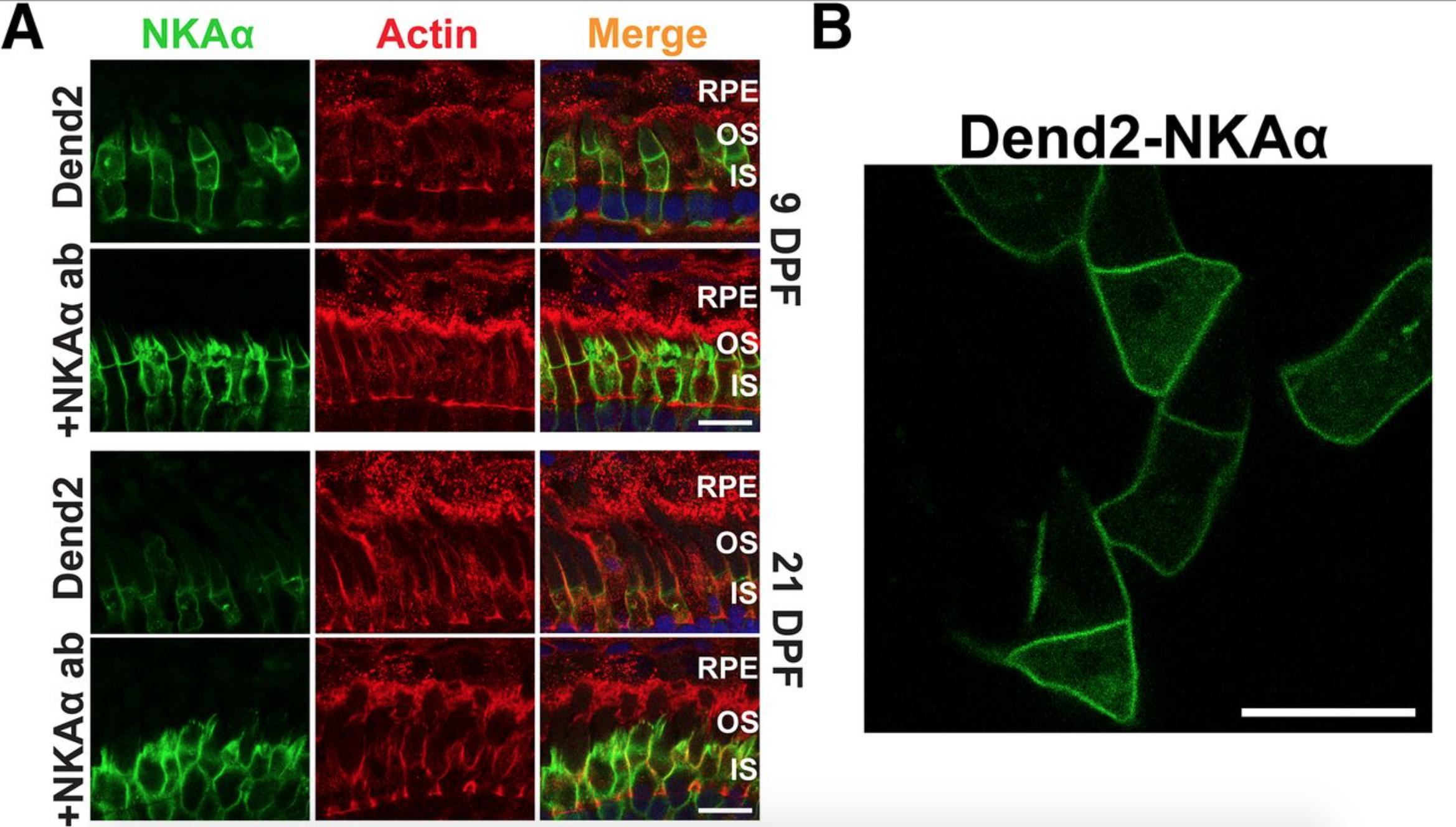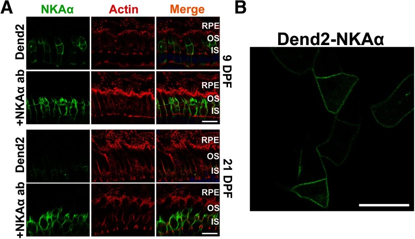 Figure 2- NKAα is not released in extracellular vesicles under normal physiological conditions. A) Cross sections of retinas expressing Dend2-NKAα were labeled with phalloidin-Alexa Fluor 633 (Actin, red) and Hoechst 33342 dye (Nuclei, blue). Retinas were 9 DPF (top two rows) or 21 DPF (bottom two rows). For each panel, either Dend2-NKAα fluorescence was imaged directly (Dend2, green) or NKAα (both endogenous and Dend2-NKAα) was visualized by immunofluorescence (+NKAα ab, green). B) Live retina explant was imaged at 9 DPF. NKAα-containing extracellular vesicles were not observed in the vicinity of rod cells expressing Dend2-NKAα. Scale bars,â10âμm. |