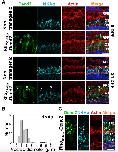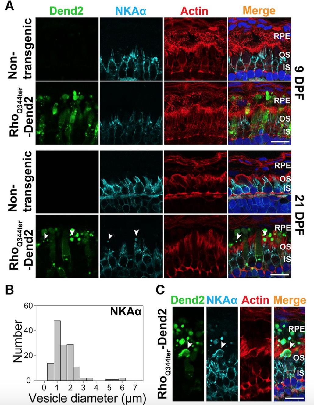 Figure 3- IS fragments containing NKAα are phagocytosed by RPE at a late stage of photoreceptor degeneration. A) Cross sections of retinas that express either no transgenic protein (Nontransgenic) or class I mutant rhodopsin fused to Dendra2 (RhoQ344ter-Dend2). Retinas were 9 DPF (top two rows) or 21 DPF (bottom two rows). Sections were labeled with anti-NKAα antibody (NKAα, cyan), phalloidin-Alexa Fluor 633 (Actin, red), and Hoechst 33342 dye (Nuclei, blue). Photoreceptor-derived NKAα was not shed in microvesicles at either 9 or 21 DPF, whereas large vesicular structures (arrowheads) containing NKAα were occasionally seen in contact with RPE microvilli or inside RPE layer at 21 DPF. B) Histogram indicating the size distribution of structures containing NKAα within the RPE layer. Retinas expressing RhoQ344ter-Dend2 were analyzed at 21 DPF. C) A cross section of 21 DPF retina expressing RhoQ344ter-Dend2 and labeled with anti-NKAα (NKAα, cyan), phalloidin-Alexa Fluor 633 (Actin, red) and Hoechst 33342 dye (Nuclei, blue). In this view, a large inner segment fragment containing NKAα (arrowhead) is being engulfed by an RPE cell. Scale bars,â10âμm. |
