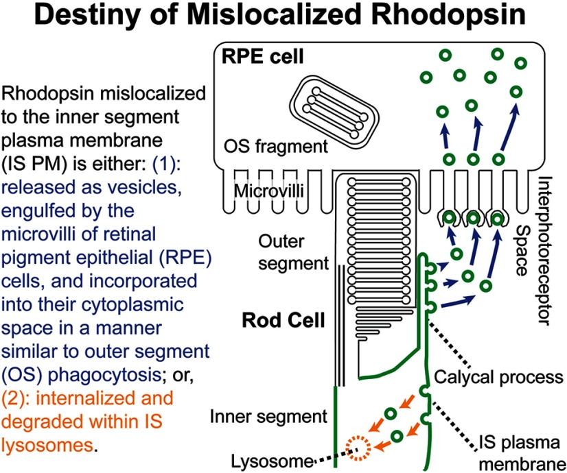 Rhodopsin is mislocalized to the inner segment plasma membrane (IS PM) in various blinding disorders including autosomal-dominant retinitis pigmentosa caused by class I rhodopsin mutations. In these disorders, rhodopsin-laden microvesicles are secreted into the extracellular milieu by afflicted photoreceptor cells. Using a Xenopus laevis model expressing class I mutant rhodopsin or Na+/K+-ATPase (NKA) fused to Dendra2, we fluorescently labeled the microvesicles and found retinal pigment epithelial (RPE) cells are capable of engulfing microvesicles containing rhodopsin. A unique sorting mechanism allows class I mutant rhodopsin, but not NKA, to be packaged into the microvesicles. Under normal physiological conditions, NKA is not shed as microvesicles to the extracellular space, but is degraded intracellularly. Those studies provide novel insights into protein homeostasis in the photoreceptor IS PM.