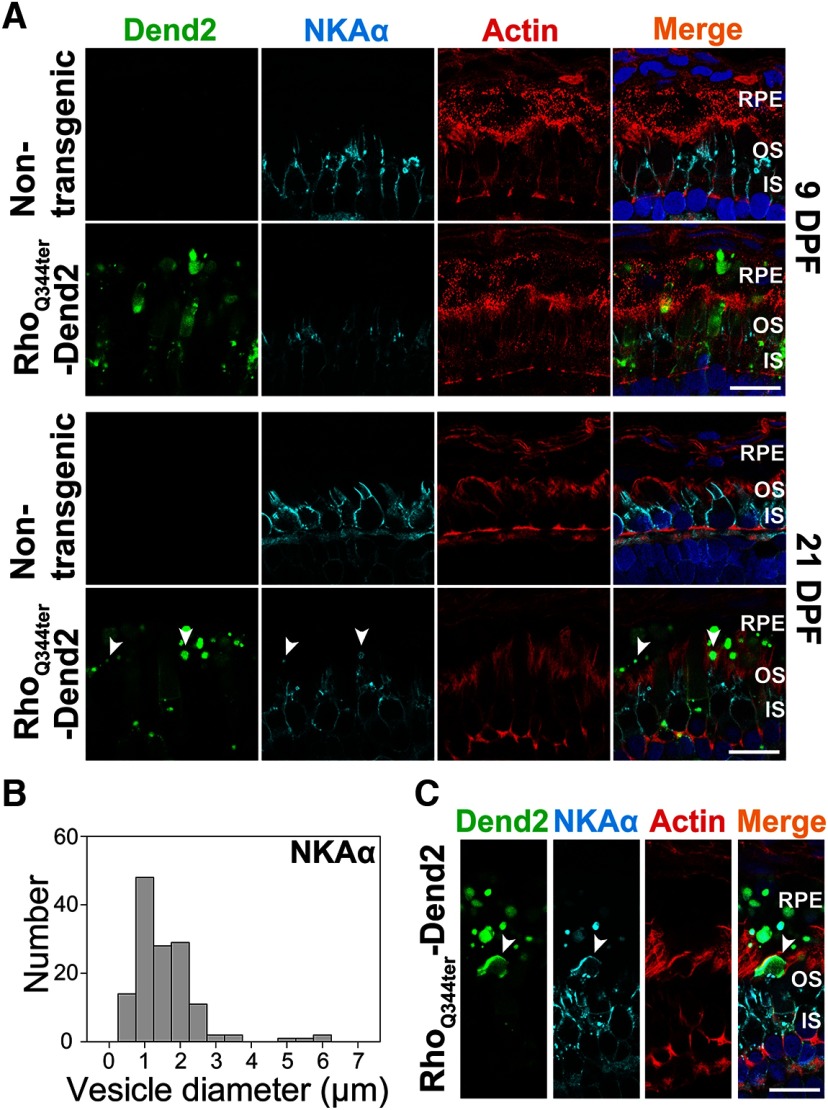 Figure 3. IS fragments containing NKAα are phagocytosed by RPE at a late stage of photoreceptor degeneration. A, Cross sections of retinas that express either no transgenic protein (Nontransgenic) or class I mutant rhodopsin fused to Dendra2 (RhoQ344ter-Dend2). Retinas were 9 DPF (top two rows) or 21 DPF (bottom two rows). Sections were labeled with anti-NKAα antibody (NKAα, cyan), phalloidin-Alexa Fluor 633 (Actin, red), and Hoechst 33342 dye (Nuclei, blue). Photoreceptor-derived NKAα was not shed in microvesicles at either 9 or 21 DPF, whereas large vesicular structures (arrowheads) containing NKAα were occasionally seen in contact with RPE microvilli or inside RPE layer at 21 DPF. B, Histogram indicating the size distribution of structures containing NKAα within the RPE layer. Retinas expressing RhoQ344ter-Dend2 were analyzed at 21 DPF. C, A cross section of 21 DPF retina expressing RhoQ344ter-Dend2 and labeled with anti-NKAα (NKAα, cyan), phalloidin-Alexa Fluor 633 (Actin, red) and Hoechst 33342 dye (Nuclei, blue). In this view, a large inner segment fragment containing NKAα (arrowhead) is being engulfed by an RPE cell. Scale bars,â10âμm. |
