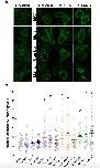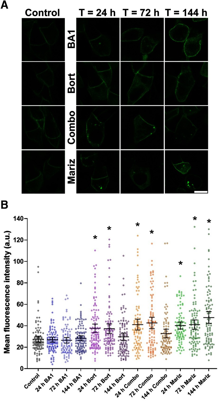 Figure 4- NKAα proteins are degraded intracellularly in rod photoreceptors. A) Representative images of rod cells from animals expressing Dend2-NKAα and treated with either the vehicle (DMSO, control), 100 nm BA1, 100 nm Bort, a combination of both BA1 and Bort (Combo), or 250 nm Mariz for 24–144 h. Scale bar, 5 μm. B) Estimation plot analysis of Dend2-NKAα concentration. Average fluorescence intensities of Dend2-NKAα were measured in the cytoplasmic region of individual rods (each dot). The error bars represent the mean ± 1.96 SEs (95% confidence interval). The average fluorescence intensities are indicated on the y-axis [arbitrary unit (a.u.)]. *p < 0.001 by Student’s t test (each treatment condition vs control). At least 92 rod cells (n = 92) from four independent animals were subjected to quantification for each condition. |