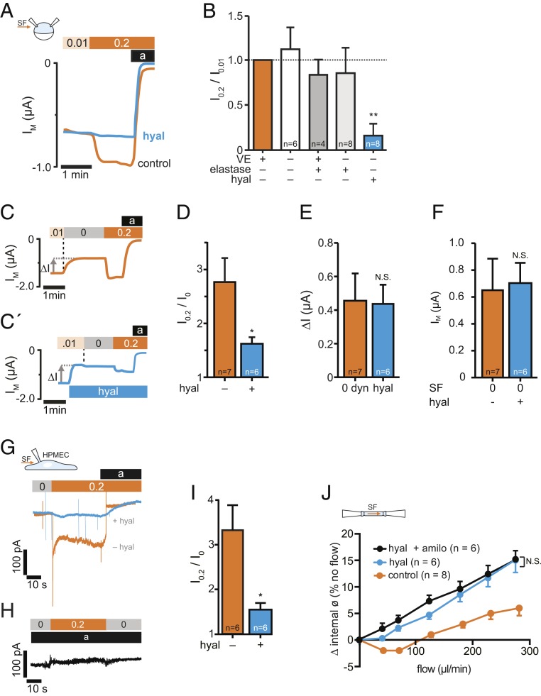 Fig. 2. SF-mediated activation of ENaC is impaired by degradation of hyaluronic acid. (A) Hyaluronidase treatment before expression of ENaC impaired the SF response (hyal, blue line) in comparison to untreated oocytes (control, orange line). (B) Averaged SF-responses (I0.2/I0.01) from oocytes following removal/degradation of ECM components (VE, vitelline envelope). SF-responses were normalized to corresponding control oocytes (intact ECM, orange bar) using cells from the same animals (mean ± SEM; **P < 0.01, one-sample t test, two-tailed). (C) Stopping the bath perfusion (0.01 â 0 dyn/cm2, indicated by a vertical dashed line) induced a current decrease (âI) and the subsequent application of SF (0 â 0.2 dyn/cm2) resulted in a current increase. (Câ²) The application of hyaluronidase (blue bar) in the presence of SF induced a similar effect on âI than stopping the bath perfusion (E), whereas the normalized SF-effect was reduced (D). (F) Membrane currents recorded in the absence of SF (0 dyn/cm2) were similar between oocytes that were untreated (â) or treated (+) with hyaluronidase (hyal, mean ± SEM; N.S., not significant, unpaired t test, two-tailed). (G) Current-traces of HPMECs, exposed to SF (0.2 dyn/cm2, orange bar). Amiloride (a, black bar) was used to estimate ENaC-mediated currents. Preincubation with hyaluronidase (hyal, blue trace), blunted the SF-induced increase of ENaC currents. (H) No SF-response was observed in the presence of amiloride (10 µM, black bar). (I) Statistical analysis from experiments depicted in G. *P < 0.05, unpaired t test, two-tailed. (J) Effect of intraluminal flow on isolated pressurized carotid arteries from mice at mean arterial pressure of 60 mmHg. Increased intraluminal flow affected the internal diameter of the arteries under control conditions (orange). Hyaluronidase augmented the SF-induced increase of the vessel diameter (blue) and amiloride in combination with hyaluronidase (black) had no additional effect (mean ± SEM; *P < 0.05, N.S., not significant, repeated-measures two-way ANOVA). |