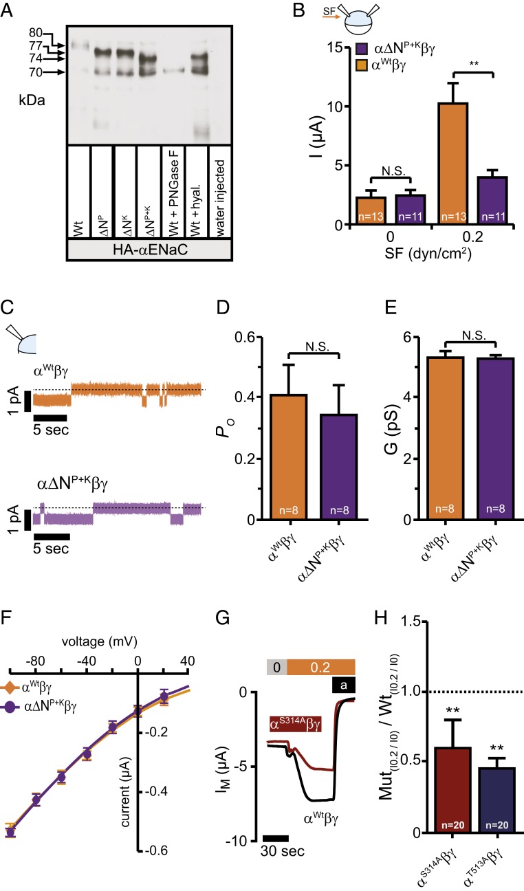 Fig. 4. N-linked glycans contribute to the SF-mediated effect but do not affect basic channel properties. (A) Immunoblotting of whole-cell lysates from oocytes expressing either HA-tagged human or wild-type αENaC (Wt) subunits with the asparagine in the palm or knuckle domains replaced or both. The shift in relative molecular mass (MR) is observed between the wild-type (∼80 kDa) and the modified subunits (∼77 kDa for ∆NP and ∆NK and ∼74 kDa for ∆NP+K) corresponding to a lack of N-linked glycosylation. Total removal of N-linked glycosylation by PNGase F resulted in the complete loss of the upper (glycosylated) band and shifted the band to ∼70 kDa (Wt+PNGase F). Treatment of wild-type with hyaluronidase resulted in a band of ∼74 kDa (Wt+hyal). Cell lysates of water-injected control-oocytes served as a control for antibody specificity. The depicted blot is representative for n = 6. (B) Amiloride sensitive currents at 0 dyn are similar, but increased in wild-type when exposed to 0.2 dyn/cm2 SF (mean ± SEM; **P < 0.01, N.S., not significant, 2-way ANOVA followed by Sidak’s multiple comparison test). (C) Current-traces of cell attached single-channel recordings at a membrane-potential of -100 mV using devitellinized oocytes. (D–F) Neither the open probability (PO), the conductance (G), nor the single-channel current voltage relationship was affected by replacement of the asparagines. Means were fitted by the Goldman–Hodgkin–Katz equation. The calculated permeability for Na+ was wild-type: 1.72 × 10−12 cm−3 s−1; α∆NP+KβγENaC: 1.73 × 10−12 cm−3 s−1 (mean ± SEM; N.S., not significant, unpaired t test, two-tailed). (G and H) Disruption of the glycosylation motif in the palm and knuckle domains did reduce the SF-mediated effect (mean ± SEM; **P < 0.01, one-sample t test, two-tailed). |