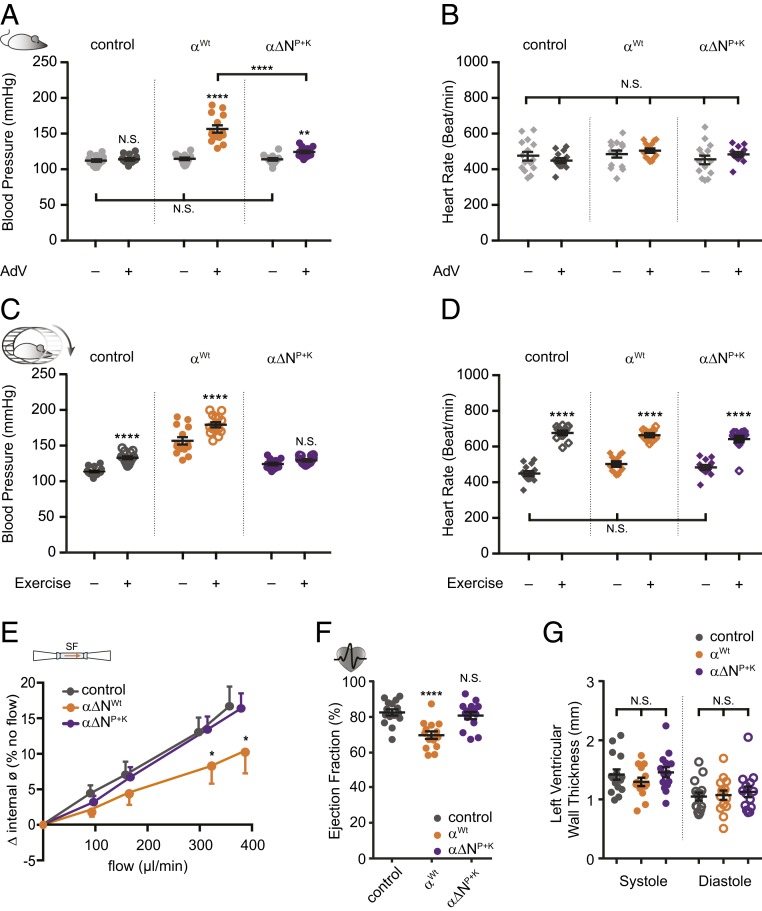 Fig. 5. Blood pressure increase after viral transduction relies on glycosylated asparagines. (A) Systolic blood pressure from three groups recorded before and after viral transduction. The increase in blood pressure was smaller in animals that received an αENaC subunit lacking asparagines in the palm and knuckle domains (αâNP+K, purple; mean ± SEM; ****P < 0.0001, **P < 0.01, N.S., not significant, 2-way ANOVA followed by Tukeyâs multiple comparison test). (B) The heart rate of the animals was not affected by the viral transduction. (C) Replacement of asparagines prevented the increase in blood pressure in response to exercise. (D) Changes in heart rate during exercise were not affected (mean ± SEM; ****P < 0.0001, **P < 0.01, N.S., not significant, two-way ANOVA followed by Tukey´s multiple comparison test). (E) Flow-mediated vasodilation was blunted in carotid arteries isolated from animals that received the wild-type αENaC subunit (n = 5; orange), whereas those of αâNP+K were protected (n = 7; purple; control: n = 5; dark gray; mean ± SEM; *P < 0.05, two-way ANOVA with Newman Keulâs multiple comparison test). (F) The increased blood pressure by αENaC transduction was accompanied by changes of the heart function including reduced ejection fraction (mean ± SEM; N.S., not significant, ****P < 0.0001, one-way ANOVA with Tukeyâs multiple comparison test). (G) Changes of the heart structure (ventricular wall thickness) were not observed (mean ± SEM; N.S., not significant, one-way ANOVA with Tukeyâs multiple comparison test). |