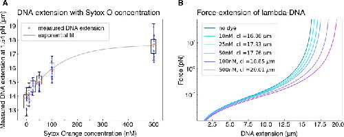 Supplementary Figure 7: Dye-induced DNA lengthening. (A) To correct for the concentration-dependent lengthening of DNA by intercalating dye Sytox Orange, we measured the extension (in ïm) of DNA molecules that we hydrodynamically stretched using a buffer flow-rate corresponding to 1.54 pN, for all Sytox Orange concentrations employed in the study. The exponential fit to the data serves as a guide to the eye. (B) The corresponding contour lengths (cl) were determined for each dye concentration by applying the worm like chain model41 to the average measured DNA extension at the known stretching force of 1.54 pN. |