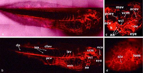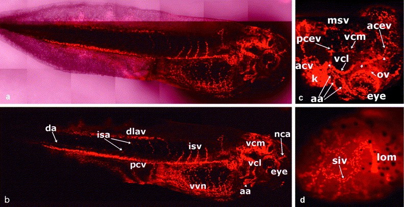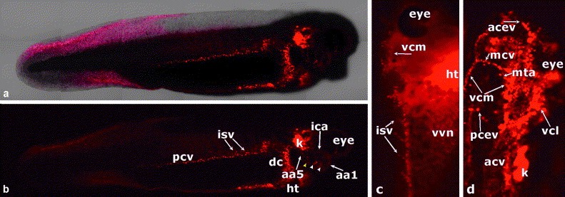 Fig. 4. Vasculature of stage 40â41 embryos. Confocal images (z-width 43.4 m) of (a) DIC and fluorescence and (b) fluorescence only of a stage 40 embryo showing the vena capitis lateralis (vcl) and the vena capitis medialis (vcm) and the further sprouting of the intersomitic vessels (isa, isv). (c) Confocal image (z-width 38.4 m) of a dorsolateral view of the head of stage 41 embryo showing the anterior cerebral vein crossing the head (acev) and the many small capillaries that cross the head between the cerebral veins, as well as the dominance of the vcl over the vcm. (d) Ventral view of a stage 41 embryo gut showing the subintestinal vein (siv) draining into the left omphalomesenteric vein (lom), taken with wide-field microscopy.