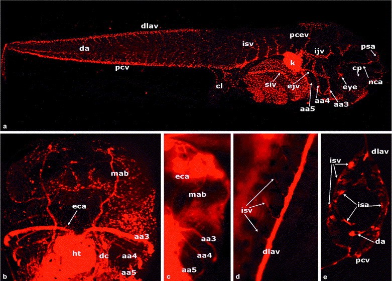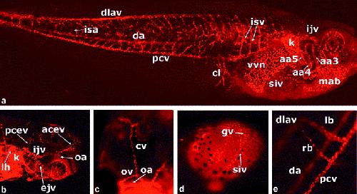 Fig. 6. Vasculature of stage 46 embryo. (a) Confocal image (z-width 1.0 m) of a lateral view of a stage 46 embryo showing the nasociliary artery and the expanding capillary networks of the dorsal head and between the intersomitic vessels (isv). (b, c) Ventral views of stage 46 embryos showing the extensive vascular supply to the filter apparatus, particularly the ventralmost venous drainage into the musculoabdominal veins (mab). The musculoabdominal veins drain into the Duct of Cuvier (dc) lateral to the heart. The persisting aortic arches (3â5) can also be seen (aa3â 5) and supply the external carotid artery (eca) and the pulmonary artery. (b) A confocal image (z-width 66.9 m) and (c) was taken with wide-field microscopy. (d) Dorsal view of the tail of a stage 46 embryo showing the dorsal longitudinal anastomosing vessel (dlav) with paired intersomitic vessels sprouting off of the dlav at regular intervals (wide-field microscopy). (e) A 10- m frozen section of a stage 46 tail showing the existence of a pair of intersomitic arteries (isa) and veins (isv) at the same intersomitic junction and the arrangement of the isa medial to the isv (taken with wide-field microscopy).