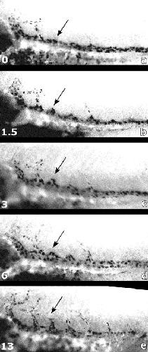 Fig. 9. Negative image of progressive outgrowth of the intersomitic vessels in a live embryo. Embryos were injected at stage 33/34 with DiI-Ac-LDL, reanesthetized every 1.5â3 h, and imaged using a Zeiss Axioplan (widefield microscopy). A typical time series is shown with representative images from stage 33/34 (time 0), and 1.5, 3, 6, and 13 h later. The third intersomitic vessel is indicated as a reference for following single vessel outgrowth. The image is presented as a negative black/white image, where black represents the fluorescent signal.