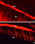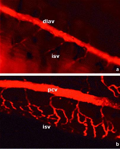 Fig. 12. Stereotypical development of the vascular system. (a) Dorsal view of the dorsal longitudinal anastomosing vessel (dlav) showing the regular pattern of paired intersomitic vessels at each somitic junction. (b) Ventral view of the posterior cardinal vein (pcv) showing the repeated pattern of intersomtic veins branching into a triple capillary system. (a) A 10 magnification taken with a Zeiss Axioplan. (b) A projection of a z-stack (z-width 27.9 m) taken with a confocal microscope.