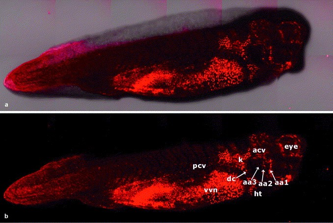 Fig. 2. Vasculature of stage 33/34 embryos at the initiation of the heart beat. Confocal images of (a) DIC and fluorescence and (b) fluorescence alone showing the heart (ht), first aortic arches (aa-3), eye, anterior (acv), and posterior (pcv) cardinal veins which drain into the pronephric sinus (k) and Duct of Cuvier (dc), and vascular vitelline network (vvn). The width of each z-slice is 23.5 m.