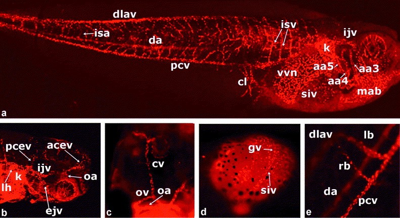 Fig. 5. Vasculature of stage 43 embryos. (a) Confocal image (z-width 24.9 m) of the profile of stage 43 embryo showing the musculoabdominal vein crossing from the ventral aspect of the head to the Duct of Cuvier, the right side position of the subintestinal vein, and the further definition and capillary sprouting of the intersomitic vessels. (b) Confocal image (z-width 42.3 m) of a dorsolateral view of stage 42/43 embryo head showing ophthalmic artery (oa) entering the eye and the crossing of the external jugular vein (ejv) from the ventral head to the Duct of Cuvier. The lymph heart (lh) may also be seen. (c) Wide-field microscopy image of a dorsal view of lateral head of stage 43 embryo showing ophthalmic artery (oa) supplying blood to the eye and the ophthalmic vein (ov) draining the eye. The relationship of the ophthalmic artery arching over the ophthalmic vein can be seen. The ophthalmic vein drains into the internal jugular vein (ijv) whose tributaries include the anterior part of the cerebral vein that loops around the olfactory bulb. (d) Ventral view of the gut of a stage 43 embryo showing the subintestinal vein on the right side of the gut, draining the gastric vein (wide-field microscopy). (e) Lateral view of the dorsal longitudinal anastomosing vessel (dlav) draining into the merged posterior cardinal vein (pcv) by the dominant left branch (lb) and the lesser right branch (rb) (wide-field microscopy).