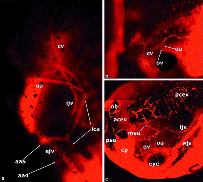 Fig. 7. Vasculature of the dorsal head of stage 46 embryos. (a) Dorsal view showing the proximal relationship of the internal carotid artery (ica) and the internal jugular vein (ijv). In addition, the ventral external jugular vein (ejv) can be seen crossing dorsolaterally to drain into the Duct of Cuvier and pronephric sinus (k). (b) Dorsolateral view of the head of a stage 46 embryo. (a) and (b) were obtained using a Zeiss Axioplan. (c) A dorsolateral view obtained using confocal microscopy (z-width 30.0 m).