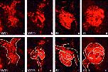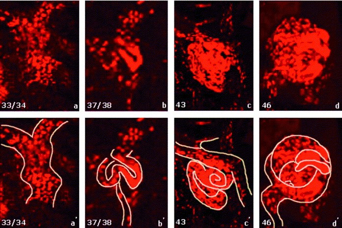 Fig. 8. Development of the vasculature of the pronephric sinus from stage 33/34 to stage 46 showing the progressive folding of the sinus into a tangled knotof vessels. (aâd) Magnifications of confocal images with z-widths of 23.6, 37.8, 43.4, and 22.0 m, respectively. (a âd ) are tracings of (aâd).