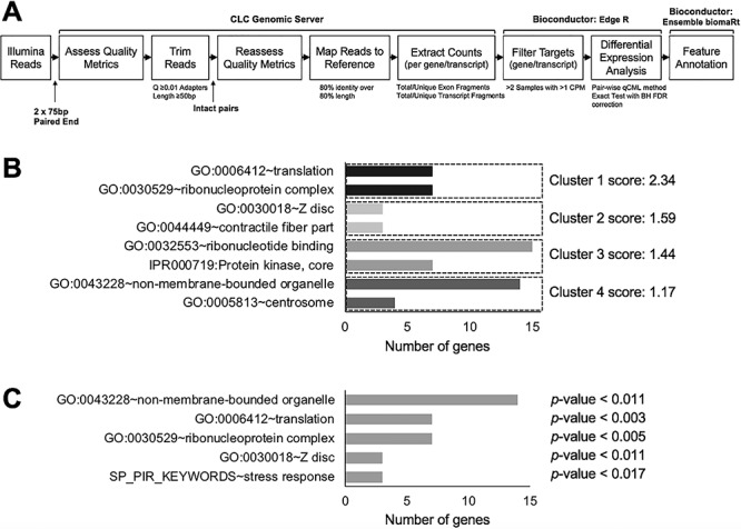 Figure 2. RNA-Seq analysis of Tdrd7â/â lens. (A) Bioinformatics pipeline for analyzing RNA-Sequencing data; delineating various steps for quality control, adaptor removal, sequence integrity, sequence mapping, estimating counts per transcript and differential analysis. (B) Gene ontology (GO) analysis of 49 differentially expressed genes with fold change (FC) >1.5 and FPKM >10 expression in lens tissue. (C) GO analysis of 85 differentially expressed genes with FC >1.5 and FPKM >â5 expression in lens tissue. (C) GO analysis of 168 differentially expressed genes with FC >1.5 and FPKM >â2 expression in lens tissue. |