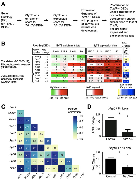 Figure 3. iSyTE-based analysis of Tdrd7â/â lens RNA-Seq data identifies Hspb1 among the high-priority candidates. (A) Flowchart of analysis of RNA-Seq data for the identification of high-priority candidate genes in Tdrd7â/â lens. (B) An integrated analysis using iSyTE lens expression and enrichment data along with functional annotation and GO enrichment of significant (FC ±1.5, P-value â¤â0.05) RNA-Seq differentially expressed genes (DEGs). GO categories for DEGs are indicated on the left. iSyTE-based expression and enrichment data at normal embryonic and postnatal lens development stages (E10.5, E12.5, E16.5 and P0) for the Tdrd7â/â lens DEGs are represented in the heat map diagram using âredâwhiteâgreenâ and âredâwhiteâwhiteâ color gradients, respectively. Lens expression of DEGs at early postnatal stage P0 over that at early embryonic stage E10.5 (expression in late versus early lens) is represented using âblueâwhiteâyellowâ color gradient. (C) Pearson correlation heat map of candidate genes based on iSyTE wild-type lens expression data across the four developmental stages. The integrated approach outlined in (AâC) applies GO category enrichment as well as iSyTE-based analysis of DEGs and associates Hspb1 as a top priority candidate gene (criteria: expression score in normal lens >2000, enrichment score in normal lens >â4.0, differential expression in Tdrd7â/â lens >1.5-fold change, P-value <0.05). (D) RT-qPCR analysis of Hspb1 validates its downregulation in Tdrd7â/â lenses at stages P4 and P15. Asterisk indicates P-value <0.01. |