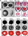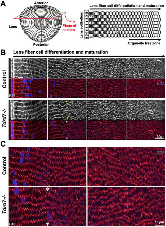 Figure 6. Phalloidin staining for F-actin demonstrates abnormal cellular morphology specifically in fiber cells after nuclear degradation in Tdrd7â/â lenses. (A) Diagram of a lens (left) with the cross-sectional plane (red) through the lens equator. Schematic of the resulting lens equatorial cross section (right) wherein epithelial cells are located at the periphery and hexagonal morphology of fiber cells is visualized. Early to late maturation stages of differentiating fiber cells are indicated, along with the organelle-free zone. (B) Control and Tdrd7â/â lens sections at P15 were stained with phalloidin to visualize F-actin. DNA was visualized by Hoechst stain. Images from comparable areas representative of early to late fiber differentiation and maturation (left to right) are shown for control and Tdrd7â/â lenses. There is no discernable difference in young differentiating and maturing lens fiber cells (left-most panel and left-half of the second panel) between control and Tdrd7â/â lenses. However, coinciding with nuclear degradation (asterisk), fiber cells in Tdrd7â/â lens showed abnormal F-actin distribution, indicative of abnormal fiber cell morphology as compared to control (second panel). (C) Zoom-in of middle image panels shows abnormal fiber cell morphology and F-actin distribution coinciding with nuclear degradation (asterisk) and beyond in Tdrd7â/â lens. |