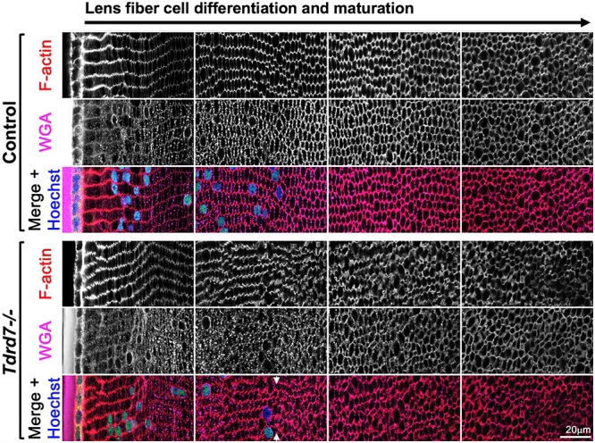 Figure 7. WGA and F-actin staining demonstrates abnormal membrane morphology and fiber cell organization specifically in fiber cells with nuclear degradation in Tdrd7â/â lenses. Control and Tdrd7â/â lens sections at mouse stage P15 were stained with wheat germ agglutinin (WGA) and phalloidin to visualize cellular membrane and F-actin, respectively. Hoechst stain was used to visualize DNA. Images from comparable areas representative of early to late fiber differentiation and maturation (left to right) are shown for both control and Tdrd7â/â lenses. While there is no discernable difference in young differentiation and maturing lens fiber cells at the lens periphery (left-most panel and left-half of the second panel) between control and Tdrd7â/â lenses, fiber cells showed abnormal WGA staining and abnormal fiber cell morphology in the Tdrd7â/â lens, coinciding with nuclear degradation (arrowheads), compared to control (second panel). |