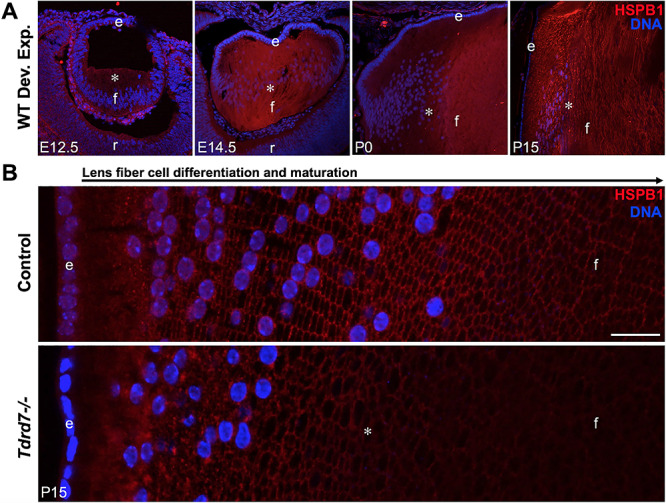 Figure 8. HSPB1 protein staining in fiber cells increases during normal lens development but is reduced in Tdrd7â/â lens fiber cells. (A) To examine HSPB1 protein expression in normal mouse lens development, immunostaining with HSPB1 antibody was performed on sagittal sections of wild-type mouse embryonic lenses E12.5 and E14.5 and postnatal lenses at P0 and P15. HSPB1 is progressively expressed in lens fiber cells during development (asterisk). (B) Cross sections of control and Tdrd7â/â P15 lenses were immunostained with HSPB1 antibody. Reduction in HSPB1 protein staining in Tdrd7â/â fiber cells that have lost their nuclei is indicated by asterisk. DNA (blue) is stained by DAPI. Scale bar indicates 20 μm. Abbreviation: e, anterior epithelium of the lens; f, fiber cells; r, retina. |