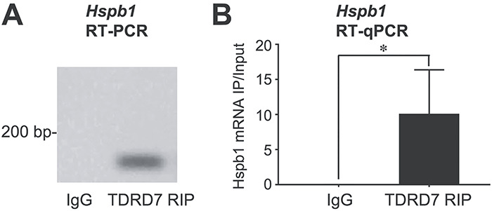 Figure 9. TDRD7 protein associates with Hspb1 mRNA in the lens. RNA immunoprecipitation (RIP) analysis using TDRD7 antibody was performed for wild-type mouse lenses at stage P15. This was followed by (A) RT-PCR and (B) RT-qPCR analysis, both of which demonstrate that Hspb1 mRNA is enriched in TDRD7 pulldowns compared to control. Asterisk indicates P-value <0.05. |