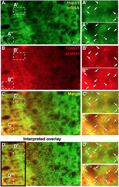 Figure 10. Single-molecule fluorescence in situ hybridization (smFISH) coupled with immunostaining demonstrates TDRD7 protein to co-localize with Hspb1 mRNA in lens fiber cells. (A) Wild-type mouse lens at stage P15 was stained with complementary RNA probes specific to Hspb1 mRNA (green), (B) along with immunostaining for TDRD7 protein (red). (C) Merged image of the co-staining (yellow) and (D) analysis of significant co-localization of Hspb1 mRNA and TDRD7 protein using custom-written MATLAB program as described in Methods (colored open circles). (Aâ-Dâ) shows zoom-in of regions indicated by broken-line boxes in AâD. Arrows indicate co-localizing elements scored by the MATLAB analysis. |