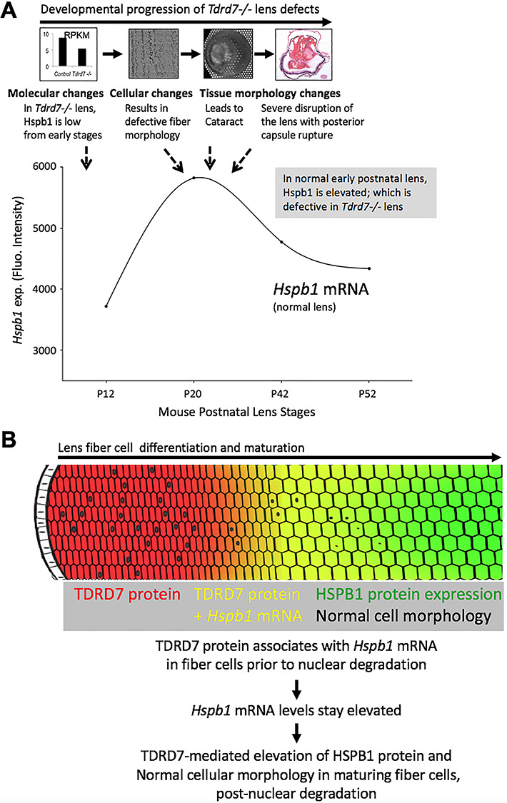 Figure 12. Models for TDRD7 function in lens development and cataractogenesis. The following models are proposed to explain the temporal and the cell and molecular basis of the lens defects and cataract observed in Tdrd7â/â mice. (A) Overlay of temporal aspects of Tdrd7â/â lens defects, at a molecular and phenotypic level, corresponding to wild-type expression of the TDRD7 target mRNA Hspb1, a heat shock protein associated with F-actin under stress conditions, in normal mouse lens development. iSyTE microarray-based expression analysis of wild-type lenses shows that mRNA expression of Hspb1 upregulates before slight downregulation, but yet maintaining relatively high levels in postnatal wild-type lens development. Interestingly, Tdrd7â/â lenses show reduced levels of Hspb1 mRNA at early postnatal stages (RNA-Seq, RT-qPCR data), several days prior to morphological detection of the lens cellular defects. Furthermore, HSPB1 protein levels remain low in Tdrd7â/â lenses in later postnatal stages at P15 (proteome, western, immunofluorescence data), just prior to the initial detection of the defect at the cellular level (SEM at P18) or the gross morphological level (overt cataract at P22). The timing of expression of the lens defects in Tdrd7â/â mice coincides with the timing of normal upregulation of Hspb1 in wild-type postnatal lens development and therefore may reflect the disruption of the expression dynamics of this F-actin-associated protein upon TDRD deficiency. (B) Based on the current molecular and phenotypic data, including the critical observation that Tdrd7â/â mice show abnormal cellular morphology particularly in fiber cells after nuclear degradation, the following model is proposed. The association of TDRD7 protein with Hspb1 mRNA ensures its elevated levels, which translate into high levels of HSPB1, a heat shock molecular chaperone protein necessary for F-actin stability in cells subjected to stress. TDRD7-based elevated levels of HSPB1 protein may function in the maintenance of normal F-actin distribution and cellular morphology in late maturation stage fiber cells, which can be considered a stress-like condition as they undergo nuclear degradation. |