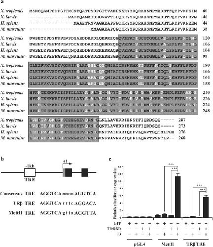 Figure 2: Mettl1 methyltransf_4 domain is highly conserved evolutionally and liganded TR enhances Xenopus tropicalis Mettl1 promoter activity in vivo. a Amino acid alignment of Mettl1 from X. tropicalis, X. laevis, H. sapiens and M. musculus. The boxed region is the methyltransf_4 domain. Shaded amino acids indicate conserved residues. b Schematic representation of Mettl1 promoter and the first two exons. The putative TRE is shown as a white box. Gray box indicates the putative 5′ UTR of Mettl1 and black boxes indicate exons. The putative TRE is located at − 1128 bp from the predicted transcription start site of Mettl1 gene. c The Mettl1 promoter is activated by liganded TR in Xenopus oocytes. pGL4 was used as a negative control, and TRβ promoter construct was used as a positive control. The oocytes were injected with indicated mRNAs and reporter and harvested for luciferase assay. All data represent mean ± S.E.M. Significance value was ***P ≤ 0.005