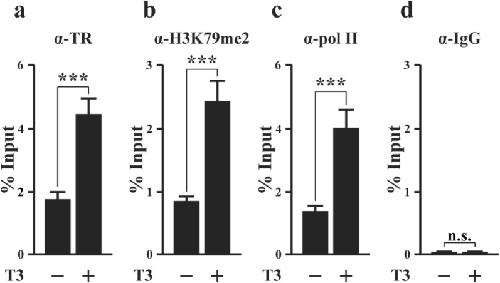 Fig. 4. TR binds to the TRE in the Mettl1 promoter region in the intestine during T3-induced metamorphosis. ChIP assays were performed with indicated antibodies on the intestine of premetamorphic tadpoles treated with or with T3. a Liganded TR is present in the TRE region of Mettl1 promoter in the intestine of premetamorphic tadpoles and the binding is increased by T3 treatment. b The level of di-methylated H3K79, a histone mark for transcription activation, increases in the TRE region after T3 treatment. c RNA polymerase II is recruited to the Mettl1 TRE region after T3 treatment. d Only background ChIP signal is detected with the negative control IgG ChIP in the presence or absence of T3 treatment. All data represent meanâ±âS.E.M. Significance value was ***Pââ¤â0.005. n.s. not significant